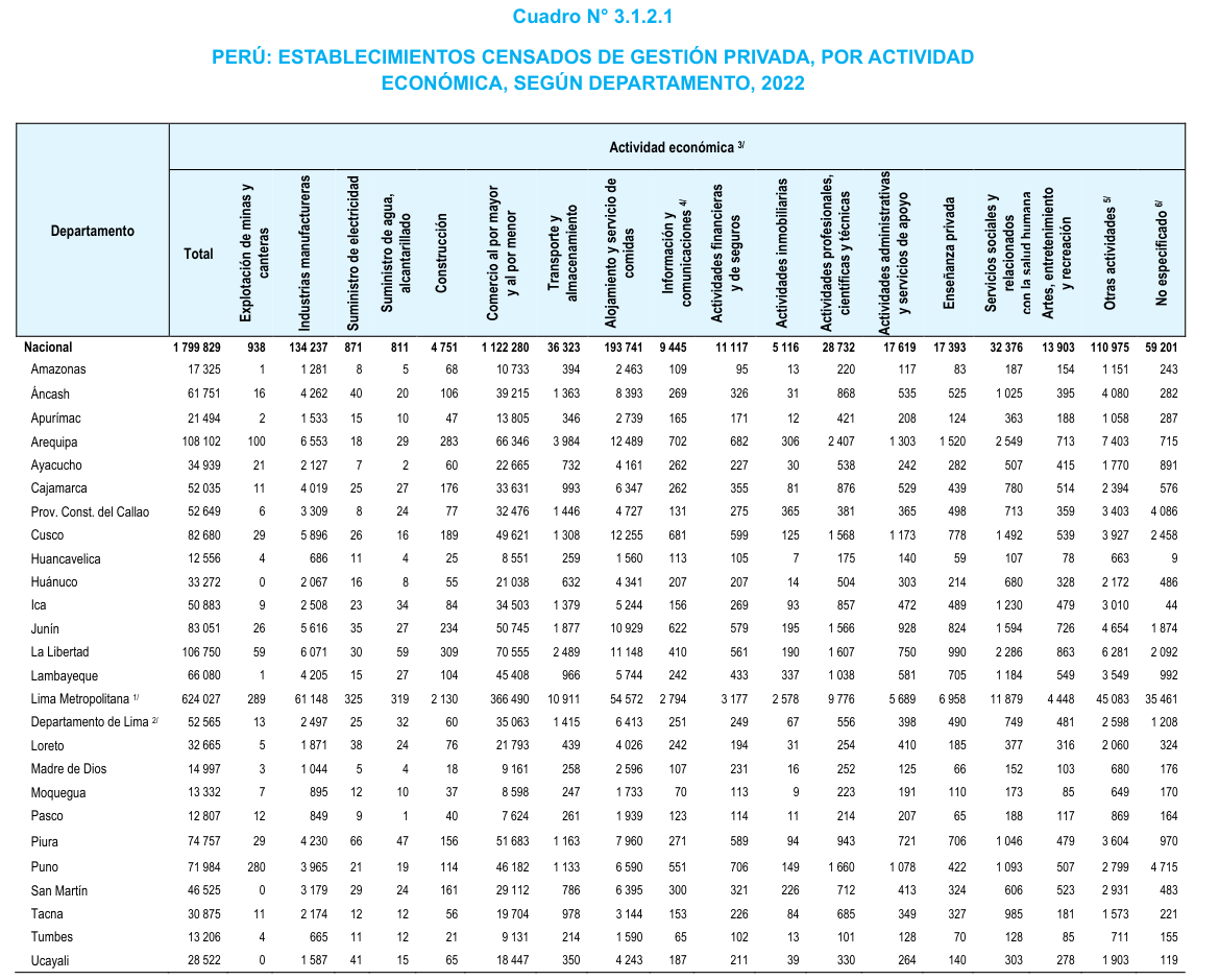 Esta cifra también la dio en una entrevista hecha por Rosa María Palacios. Sin embargo, es falsa. En el último Censo Nacional Económico de 2022, el Instituto Nacional de Estadística e Informática (INEI) determinó que a nivel nacional se registraron 2.36 millones de establecimientos y locales comerciales de todos los rubros. De estos establecimientos, 1.7 millones son de gestión privada; los demás son administrados por organismos públicos o están inactivos.