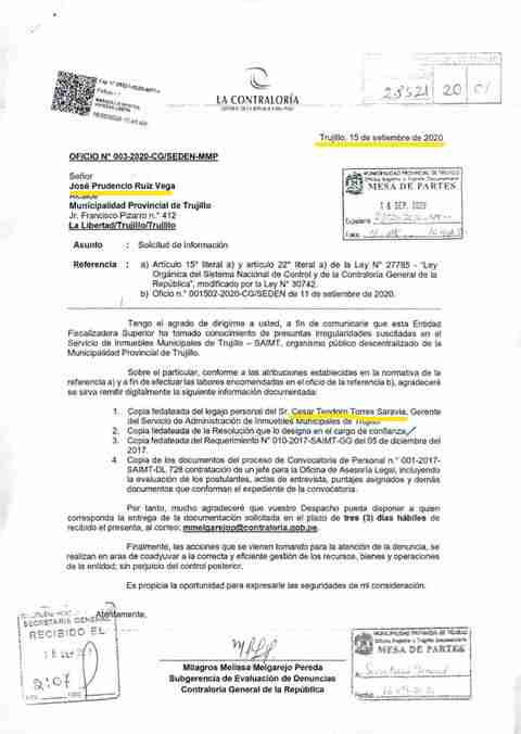 Luego de que Investiga revelara el 14 de septiembre que el gerente del Servicio de Administración de Inmuebles Municipales de Trujillo (Saimt), César Teodoro Torres Saravia, no reúne los requisitos para el cargo, el área de denuncias de la Contraloría ha solicitado información sobre el caso al alcalde provincial José Ruiz Vega.