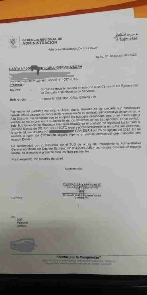 Al menos 80 trabajadores bajo el régimen CAS del Gobierno Regional de La Libertad continuarán en sus puestos, luego de que recibieran una carta de reconsideración acerca de la no renovación de sus contratos.