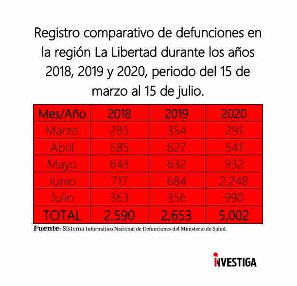 Investiga revisó el comparativo oficial del Sinadef, el Sistema Informático Nacional de Defunciones que reúne la data de fallecidos que se reportan en el Ministerio de Salud, la Reniec y el INEI y las cifras confirman de manera categórica que el mes de junio nuestra región nunca llegó a la tan ansiada «meseta». Por el contrario, ese fue el mes en el que los índices de mortalidad se dispararon y aumentaron a más del triple en comparación con el mismo intervalo de tiempo en el 2018 y 2019.