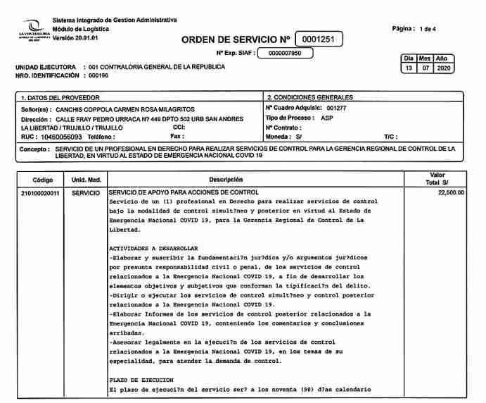 Se hizo una orden de servicio que es la 0001251 para la señora Carmen Rosa Canchis, para que nos pueda brindar el apoyo a través de la locación de servicio. Nosotros siempre tercerizamos algunos aspectos porque hay servicios que son específicos, que se requieren solamente para una opinión. El contrato de la señora venció el 11 de octubre (se inició el 13 de julio de este año). Yo la contraté para la Gerencia Regional, pero como en la Municipalidad Provincial de Trujillo se requería personal, decidí que vaya a apoyar al OCI (Órgano de Control Institucional), porque teníamos varias auditorías.