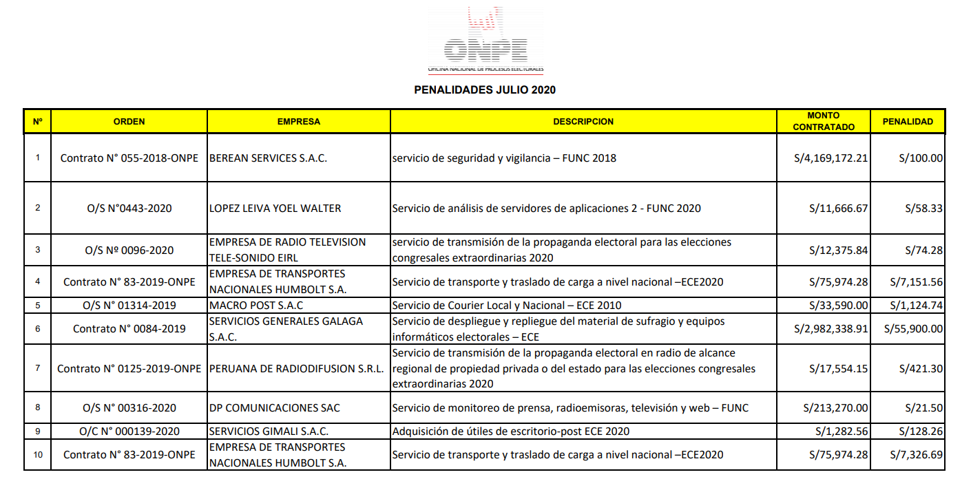 La primera se enlista en las penalidades de julio de 2020, por el contrato N°0084-2019, por el que brindó el servicio de transporte del material de sufragio y equipos informáticos electorales durante las Elecciones Congresales Extraordinarias del año 2020. El monto del contrato ascendía a S/2.82 millones. La penalidad fue de S/55,900.