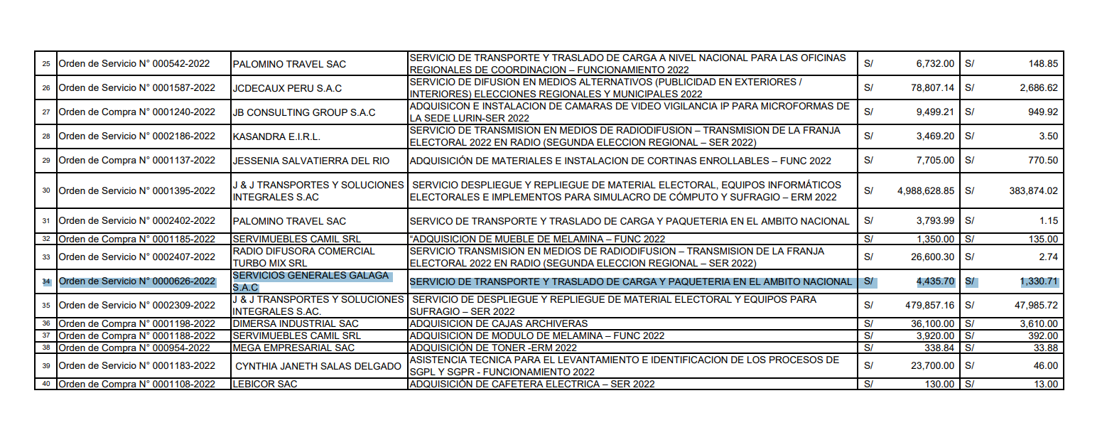 Por último, la tercera penalidad se registra en setiembre de 2023. Servicios Generales Galaga, por una Orden de Servicio N° 0000756-2023, estuvo a cargo del despliegue y repliegue de material electoral, equipos informáticos electorales e implementos para simulacro de cómputo y sufragio de las elecciones municipales complementarias de 2023. El monto del contrato ascendía a S/6.68 millones. La penalidad fue de S/6,803.17.
