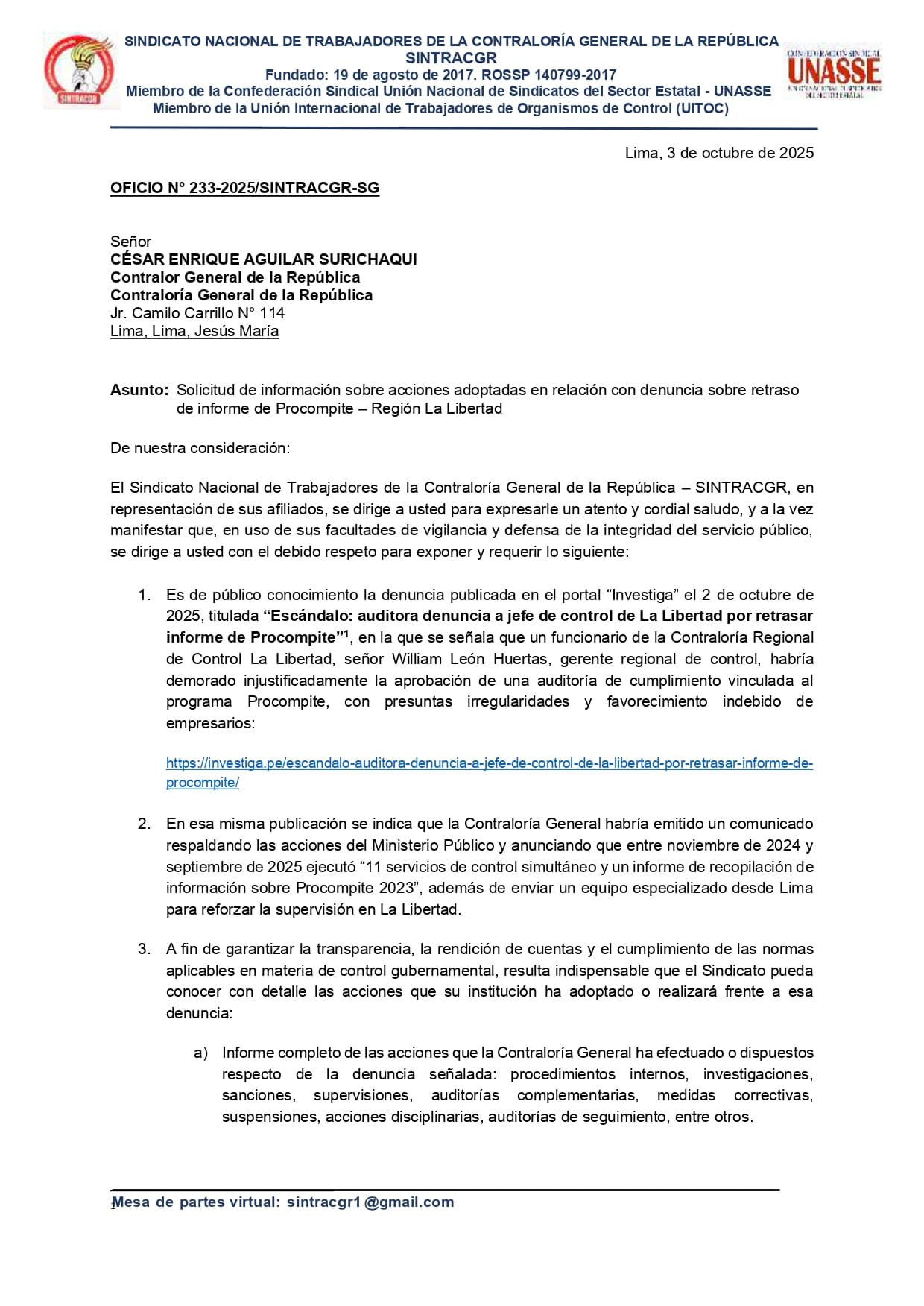 Tras los detalles expuestos por Investiga sobre el allanamiento fiscal a la sede de Control en Trujillo el pasado 1 de octubre, el Sindicato Nacional de Trabajadores de la Contraloría General de la República (Sintracgr) remitió el Oficio N° 233-2025/SINTRACGR-SG al jefe máximo de su institución para solicitarle un informe completo sobre las acciones adoptadas.