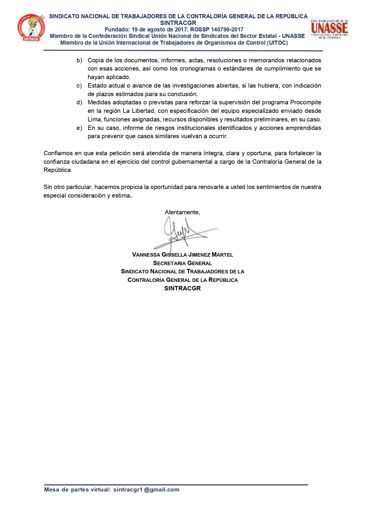 En el documento, firmado por la secretaria general del sindicato, Vanesssa Gissella Jiménez Martel, solicitan conocer el estado de las investigaciones, las medidas disciplinarias aplicadas, copias de documentos y actas vinculadas al caso, así como los plazos estimados de las indagaciones.